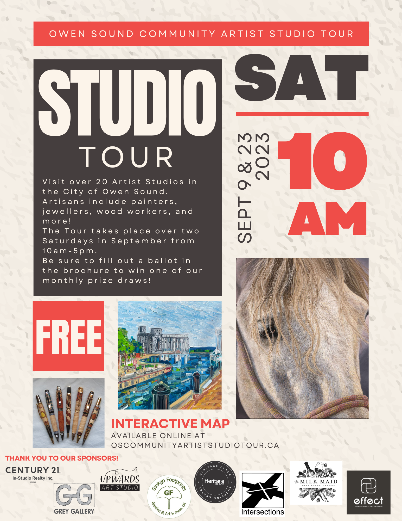 “The Owen Sound Community Artist Studio Tour will take place over two Saturdays during the month of September 2023. Each Saturday will feature artists from either the downtown Core or the Surrounding Area that includes studios located around the City.”